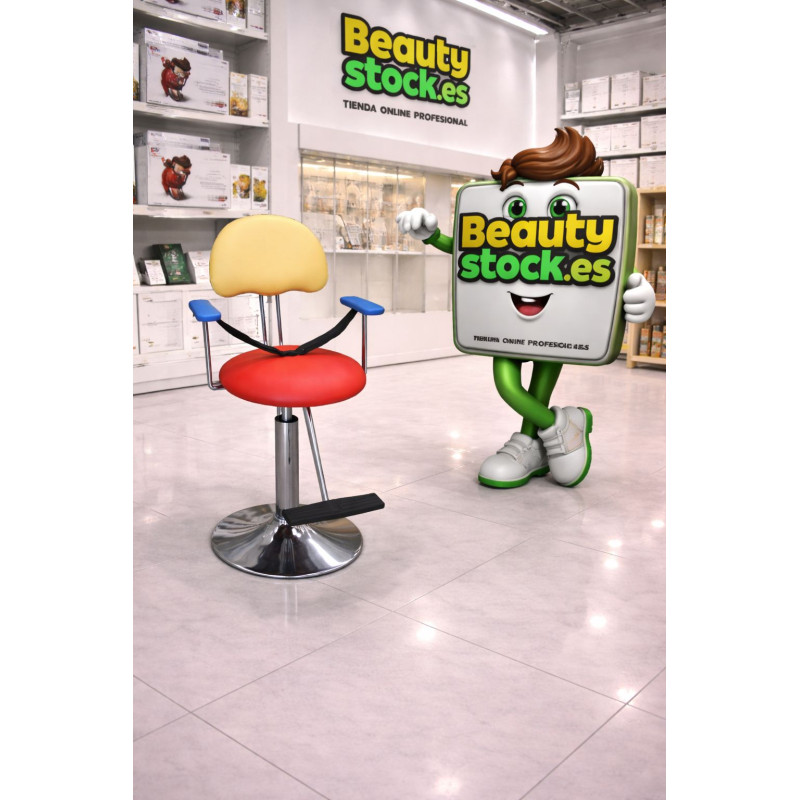 Sillita para niños/as, con varios colores, detalles en metal y cinturón. Un diseño con base redonda y colores divertidos, para que los más pequeños se sientan como en casa, mientras les cortas el pelo.