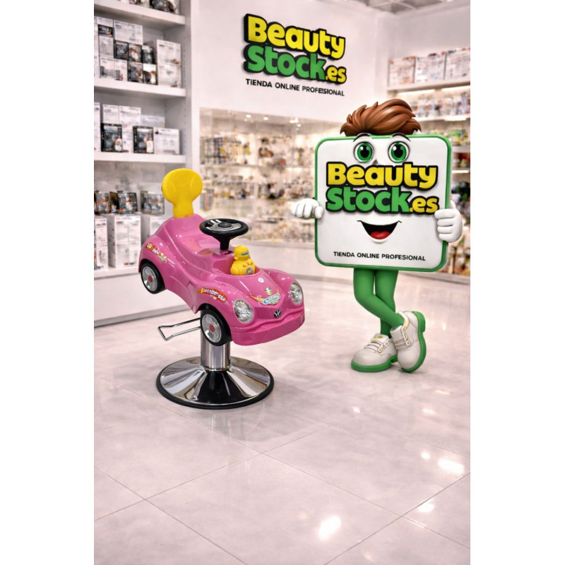 Cochecito Kids para peluquerías, color rosa, para niños/as. El cochecito ideal para cortar el pelo a los más pequeños, te facilita el trabajo y a la vez, los niños se sienten más cómodos, usando este cochecito para cortar el pelo. Ofrece siempre el mejor mobiliario en tu peluquería, tanto para los adultos como para los niños, así podrás, ofrecer este servicio profesional.