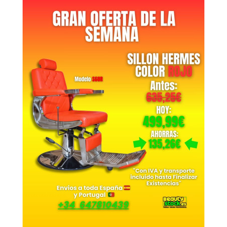 Sillón de barbero Hermes, en color rojo, robusto con respaldo reclinable, tapicería de alta calidad, en color rojo. Un sillón de barbero ideal para barberías con un estilo muy definido y que buscan un sillón diferenciador, con diseño y sin perder por ello, calidad. Bomba hidráulica ajustable en altura, giratorio y elevable. Con apoyapiés y apoyabrazos, para otorgar la máxima comodidad al cliente. Detalles en la tapicería, que le dan un toque sofisticado y elegante. Estilo retro, muy confortable, sillón barbero, ideal para profesionales que buscan un estilo propio en su barbería y una excelente relación calidad/precio. Si eres un profesional de la barbería, inscríbete en nuestra tienda especializada online, y ¡Aprovecha las promociones y ofertas, que te ofrecemos!