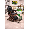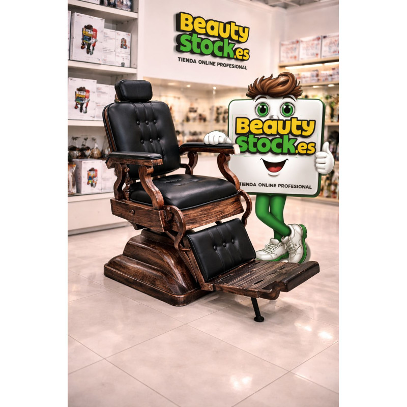 · El sillón de barbería modelo S66N combina robustez, diseño vintage y confort. Su respaldo reclinable, tapicería negra de alta calidad, apoyabrazos y apoyapiés, junto con detalles en madera y chasis bronce envejecido, ofrecen comodidad superior a tus clientes. La bomba hidráulica ajustable, giratorio y elevable garantiza flexibilidad para el profesional.